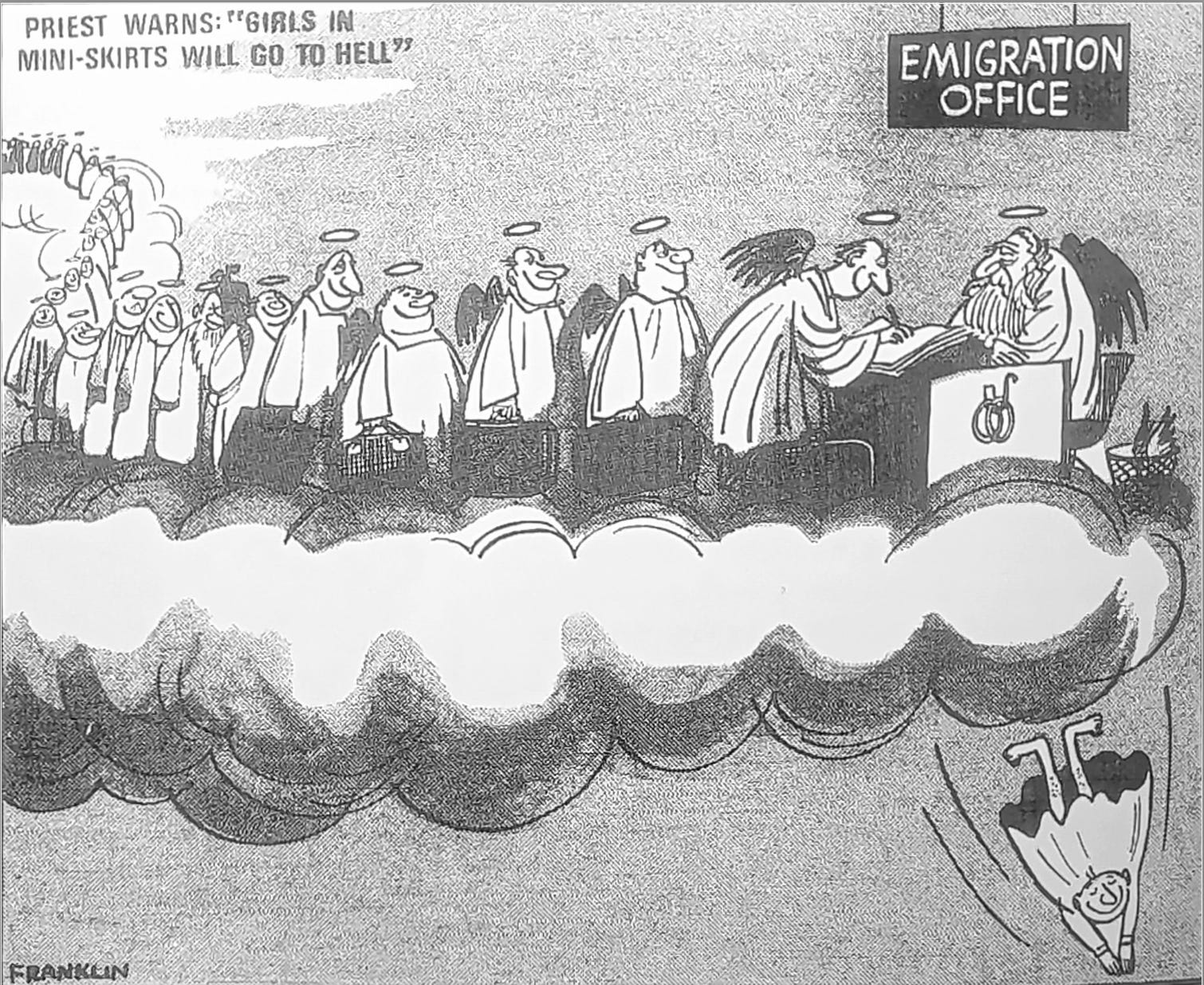 Cartoon by Stanley Franklin from the Daily Mirror, 5th June 1968. As the mini-skirt took off in the 1960s, popularised by Jackie Kennedy’s wearing of a white Valentino ‘mini-skirt’ to her wedding to Aristotle Onassis, not everyone approved.